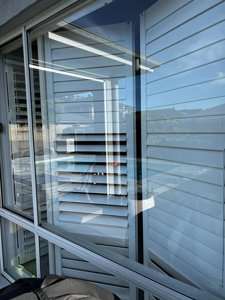 Window cleaning View through a large window with white plantation shutters, showing a suburban street with parked cars, a fenced yard, trees, and houses under a partly cloudy sky.